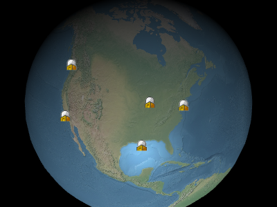 Below, the billboard is positioned at the center of the Earth but an eye offset makes it always appear on top of the Earth regardless of the viewer's or Earth's orientation.