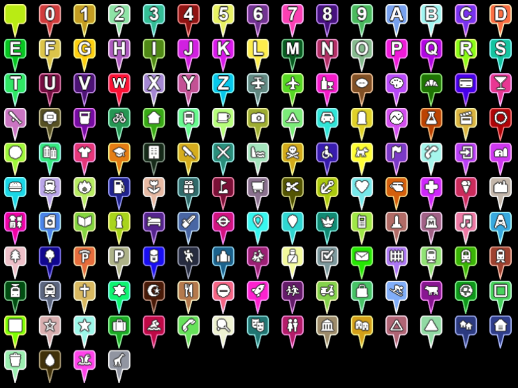 Example pins generated using both the maki icon set, which ships with Cesium, and single character text.